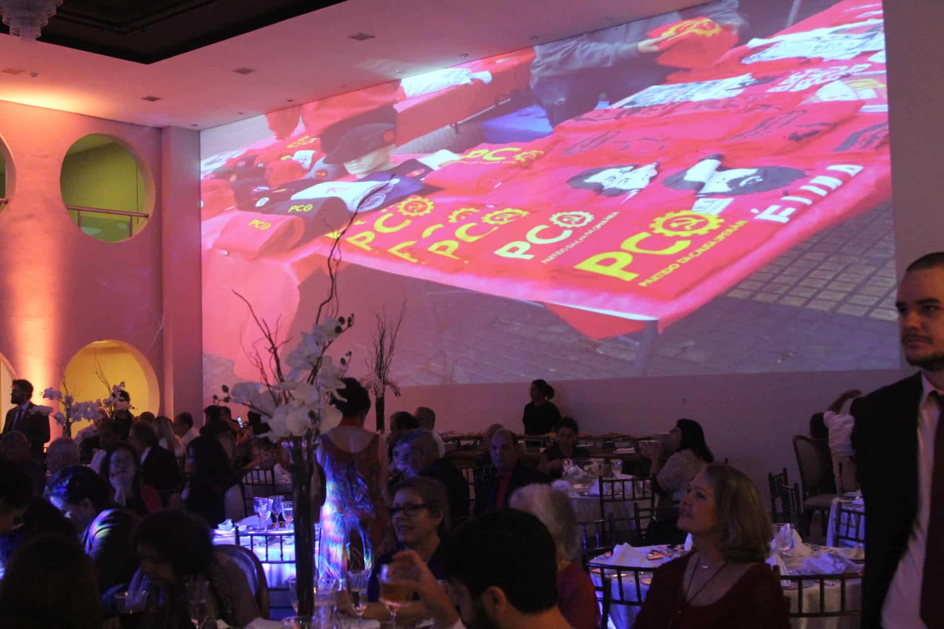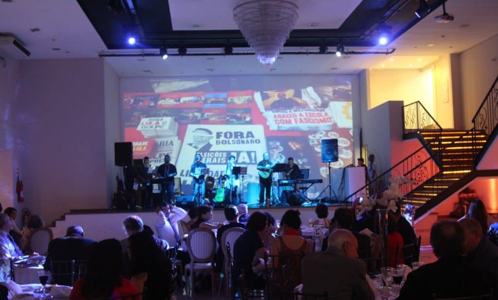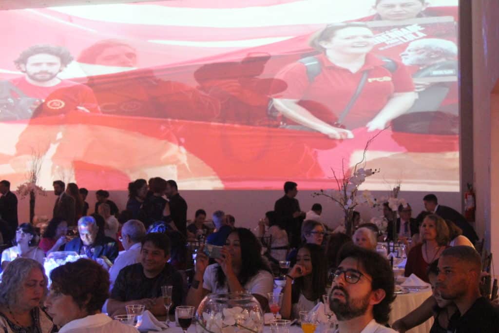 Logo na entrada da atividade, via-se uma recepção agradável, de companheiros que encaminhavam os recém-chegados para a escolha de suas mesas, que incluíam as opções de térreo e 1º andar. Ao caminhar pelo salão, repleto de iluminação colorida, no fundo do palco e na parede de fundo do salão 2 grandes telões exibiam uma apresentação de fotos de atividades do PCO neste ano, destacando a organização e participação do partido nos atos nacionais em Curitiba pela liberdade de Lula e dos atos das greves da Educação pelo fora Bolsonaro.