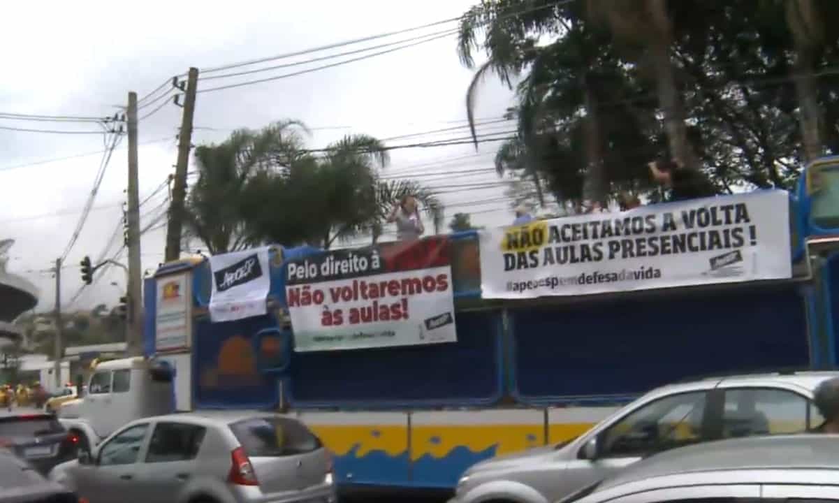 Na manhã desta quarta-feira (29), professores da rede estadual de ensino de São Paulo realizaram uma carreata com o objetivo de ir até o Palácio dos Bandeirantes para pressionar o governo de João Dória (PSDB) a cancelar o retorno às aulas, previsto pelo governo para o dia 8 de setembro.