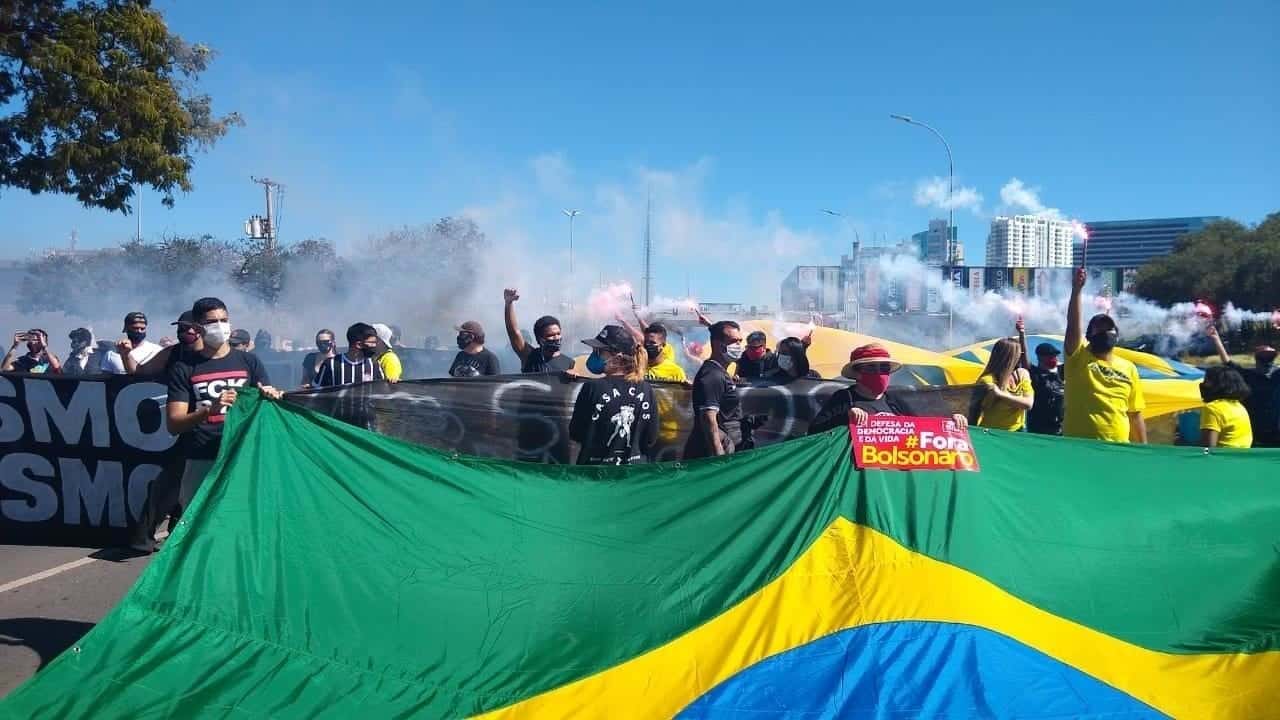 Liderados por torcedores do Vasco e do Corinthians, torcidas de vários clubes brasileiros e movimentos sociais fizeram protesto pela democracia hoje (21), em Brasília. O grupo, que ainda ainda conta com a presença de movimentos sociais, critica o presidente Jair Bolsonaro (sem partido) pelo enfrentamento da pandemia de covid-19 (Uol, 21/06/2020).