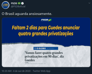 Na conta do PSDB no Twitter, o partido não conteve sua ânsia em aprofundar a entrega do país. Segundo os entreguistas, “o Brasil aguarda ansiosamente” pelo anúncio das privatizações de Paulo Guedes. Na verdade, o comitê burguês dirigente do partido é quem aguarda tal ataque às empresas estatais. No próprio site dos representantes da burguesia, fica exposto o núcleo central da política do PSDB. Segundo o próprio partido, as “privatizações estão no DNA tucano”. Resta, no entanto, pressionar Bolsonaro para que siga com o projeto de destruição da burguesia pró-imperialista e entreguista. Vale recordar que somente durante os anos de 1997, 1998 e 1999, os tucanos entregaram 123 estatais aos capitalistas.