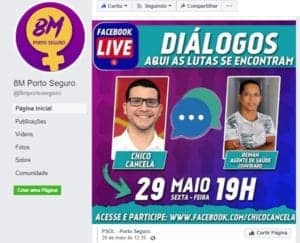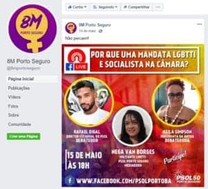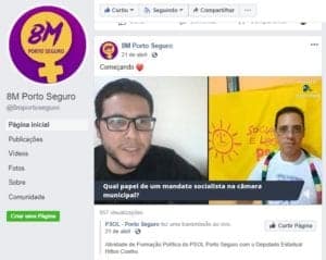 Essa avaliação fica ainda mais clara quando é observado o 8M da cidade, ligada ao movimento feminista, mas que na prática o PSOL tomou controle e transformou esse grupo em um aparato eleitoreiro do PSOL. Quando observado as postagens do 8M de Porto Seguro fica evidente que somente existem publicações do PSOL e a maioria delas sequer tem a ver com a questão das mulheres. São apenas publicações dos candidatos do PSOL da cidade como se tivessem o aval do grupo de mulheres de diversas organizações.