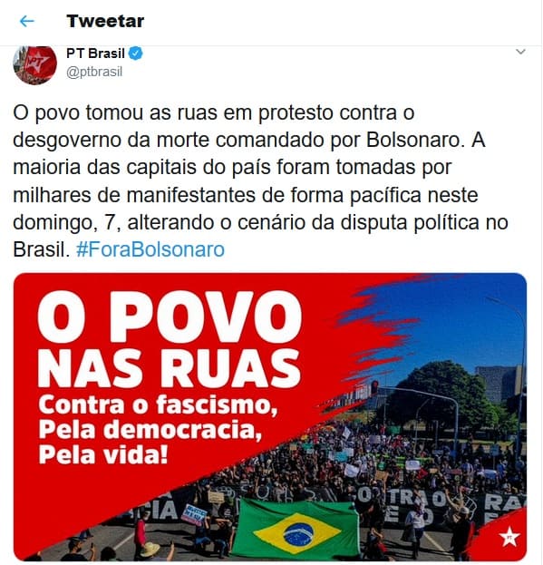 Na última semana, o Partido dos Trabalhadores (PT), compartilhou em suas páginas oficiais nas redes sociais imagens em apoio as manifestações ocorridas no último domingo. Nesta segunda (8), por exemplo, o partido fez referência aos atos do domingo da seguinte forma: