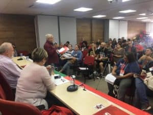 Participaram do encontro mais de 100 companheiros, em sua maioria dirigentes de organizações nacionais que integram o Comitê Nacional Lula Livre, como os partidos – PT, PCdoB, PCO e PSOL -, entidades nacionais dos trabalhadores e estudantes – CUT, UNE, MST, CMP etc. – além de representantes de Comitês Estaduais e Municipais de, pelo menos 13 Estados, mesmo com a reunião ter sido convocada com um caráter mais restrito e sem ampla divulgação.