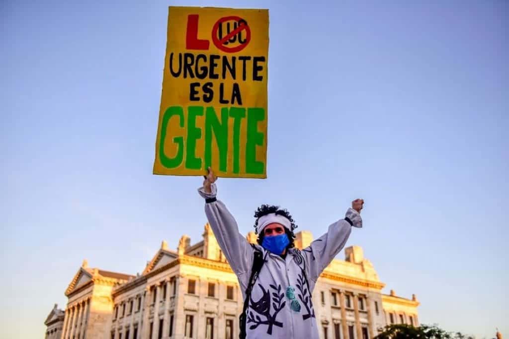 Diversos grupos sociais realizaram nesta semana a primeira mobilização popular no Uruguai após o início da pandemia . O protesto teve como impulso a Lei de consideração urgente (LUC) , adotada pelo governo , que é tida pelos manifestantes como impopular e repressiva ao povo Uruguaio. Enfrentamos a lei dos ricos nas ruas”, dizem os manifestantes.