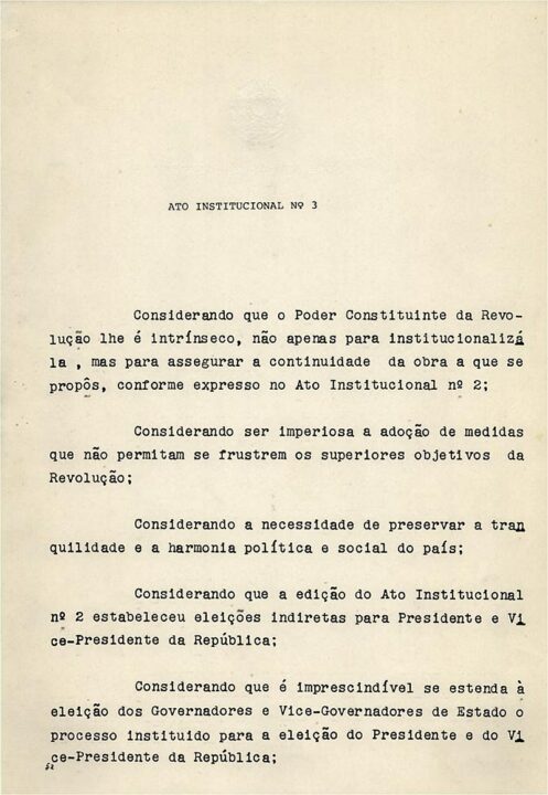 Baixado pelo Presidente Castelo Branco, um dos principais articuladores do Golpe Militar de 64, o Ato Institucional nº3(AI-3), tendo em vista ainda consolidar o violento regime militar, modifica as regras eleitorais nos estados e municípios. O AI-3 permitiu que Senadores e Deputados Federais ou Estaduais, com prévia licença e indicados, pudessem exercer o cargo de Prefeito de Capital de Estado.
