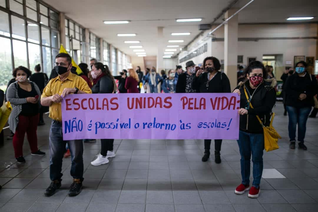 No Rio Grande do Sul, mais de 60 diretores e diretoras de escolas estaduais de Porto Alegre convocaram uma coletiva de imprensa em outubro de 2020 para se posicionar contra o retorno presencial.