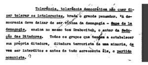 Quando baniram o PCB, um democrático desta laia disse “Tolerância, tolerância democrática, não quer dizer tolerar os intolerantes”, que democracia, hein? Isso serve para ensinar, o “extremista violento” hoje é o Trump, amanhã será o operário comunista. Deixo o Um trecho da decisão do TSE de 1946.