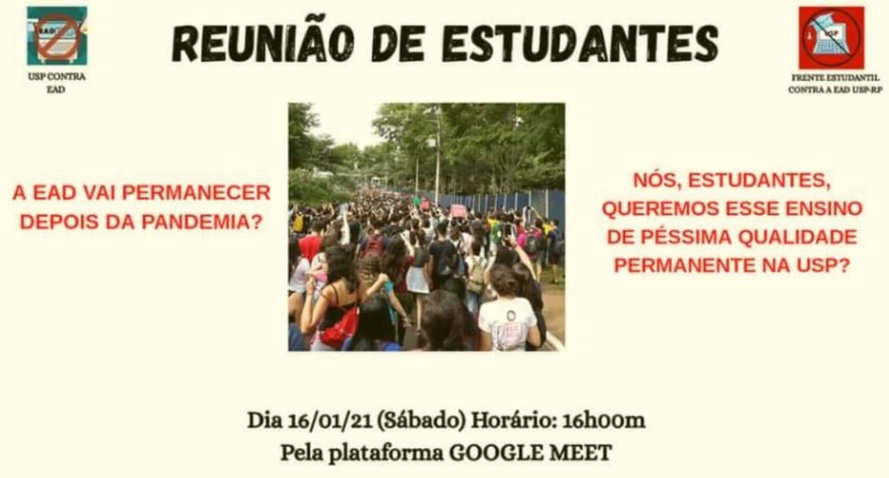 Hoje, dia 16/01, as organizações estudantis Frente Estudantil contra a EaD USP-RP e a Frente contra o EaD estão convocando uma assembleia com os estudantes de toda a USP para discutir o EaD, a implementação da farsa do Ensino Híbrido e o genocídio que representa a volta às aulas em plena pandemia. Ambas as organizações tem se mobilizado ativamente contra os ataques dos golpistas e dos bolsonaristas contra educação e contra a juventude desde o ano passado e convocado assembleias para mobilizar.