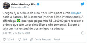 Por outro lado, as comemorações tiveram que ser adiadas, vendo que o diretor Kleber Mendonça foi as redes sociais para informar sobre a parada do troféu de melhor filme internacional, vindo de fora do país, na alfandega brasileira. O governo de Bolsonaro e da burguesia, que a partir de suas medidas neoliberais contra a cultura e o cinema em especifico, que cortou qualquer apoio financeiro para ajudar filmes brasileiros em premiações e eventos internacionais, que ocorreria via Apex e Ancine, também cobra para que aqueles prêmios conquistados entrem no país via Alfândega.