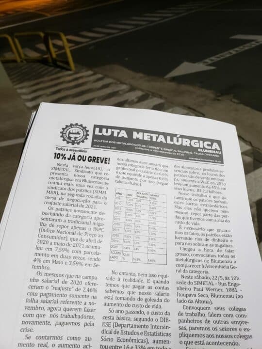 A corrente sindical nacional do PCO, Luta Metalúrgica, está em uma campanha salarial aguerrida contra os patrões das empresas do setor. A categoria não baixa a cabeça e exige 10% de aumento real ou paralisação total das atividades.