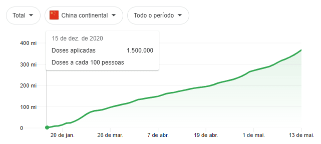 Ao contrário do que declara Doria, o principal motivo da falta de vacinas não é tanto Bolsonaro, que particularmente, assim como Doria, nunca fez nada em nome da vacinação da população. O caso ocorre justamente quando a China decidiu aumentar consideravelmente a vacinação de sua própria população. Entre os dias 12 de abril a 12 de maio a China vacinou 200 milhões de pessoas, mais do que os 180 milhões vacinados entre o final de dezembro e o mês de abril. São milhões de doses aplicadas diariamente, fazendo com que o país ultrapassasse os Estados Unidos e atingisse 367 milhões de doses aplicadas.