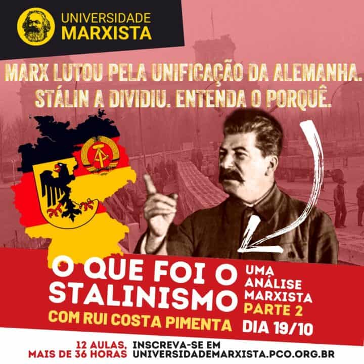 As aulas serão exibidas ao vivo, nas terças e quintas-feiras, com leitura de comentários e dúvidas. Os temas tratados, por exemplo, serão a partilha da Alemanha no pós-guerra, o esmagamento dos operários em Praga, o ataque ao Movimento de 1968, o apoio dos stalinistas ao golpe imperialista contra Getúlio Vargas em 1945, as confusões políticas que os levarão a ficar inertes em relação ao golpe de 1964 no Brasil; também trataremos dos boicotes às revoluções na Europa, o desarmamento dos operários italianos, dos boicotes aos movimentos de independência dos países africanos, entre muitos outros temas. O curso é imperdível e a primeira aula já se encontra disponível na plataforma! Para aqueles que desejarem assistir-lhe, basta acessar o link do site e fazer a inscrição: https://universidademarxista.pco.org.br/