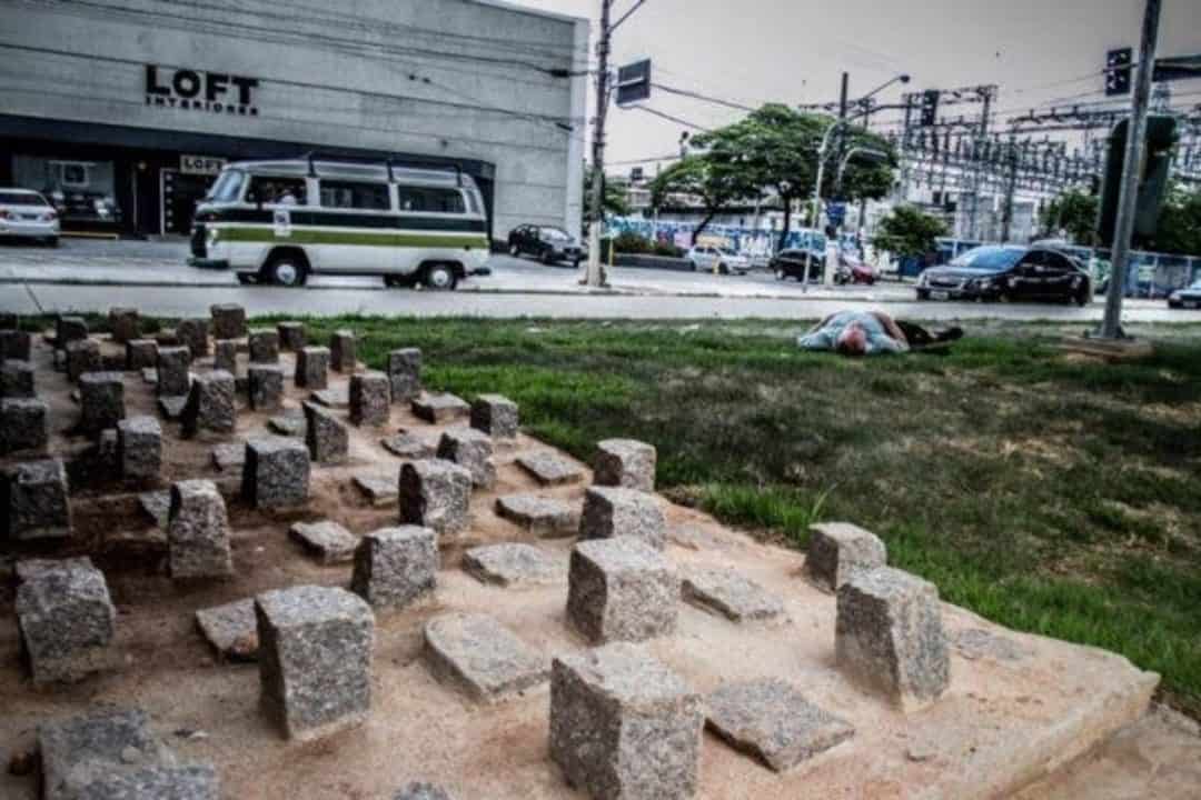 Na última quinta-feira (28), funcionários de uma empresa contratada pela prefeitura fascista de Bruno Covas (PSDB), na capital de São Paulo, concluíram a colocação das pedras, que são presas ao chão por uma espessa camada de cimento, na parte debaixo do viaduto Dom Luciano Mendes de Almeida, na avenida Salim Farah Maluf, que fica no Tatuapé (zona leste de SP), sentido bairro da avenida.
