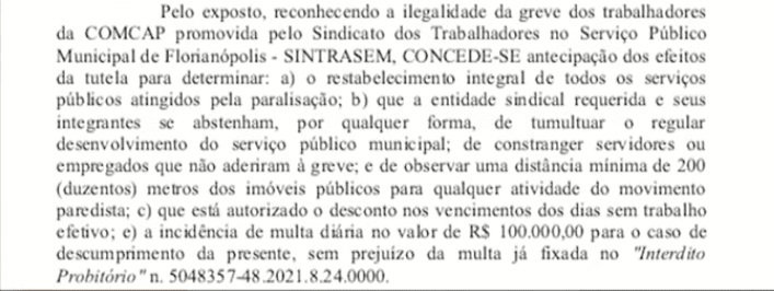 O Judiciário decretou a greve como ilegal na manhã desta quinta-feira (23), em um flagrante ato ditatorial, instituindo inclusive uma multa de 100 mil reais por dia ao sindicato.