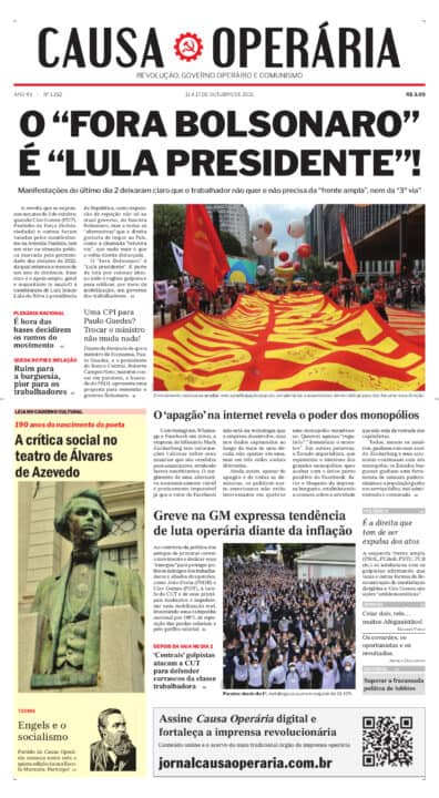 Começa a chegar hoje, em diversas cidades de todo o País, o novo jornal Causa Operária. O maior e mais tradicional órgão da imprensa revolucionária do Brasil trata em sua capa, de uma das principais conclusões política do ato “fora Bolsonaro”, com participação de pelegos e golpistas de toda sorte: a única palavra de ordem consequente ao “fora Bolsonaro” é “Lula presidente”. Se antes haviam dúvidas quanto a isso, estas foram definitivamente dissipadas após o dia 2 de outubro. E claro, esse é o grande destaque da edição nº 1.182.