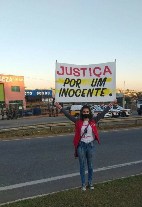 Foto da irmã de Jefferson segurando uma faixa por justiça – foto fornecida pela família