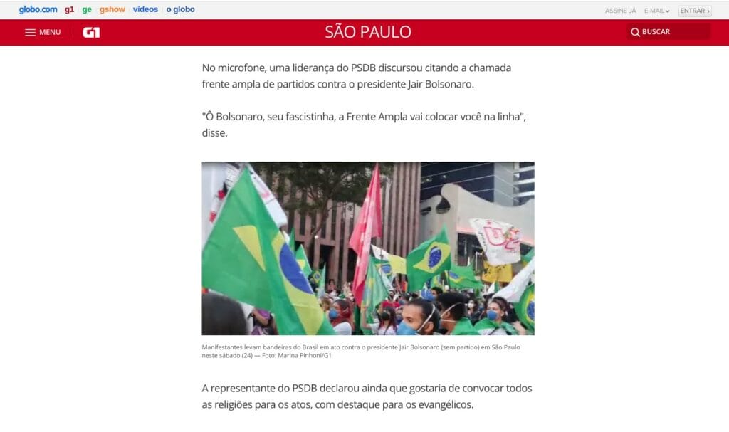 O portal G1, da Rede Globo, publicou uma reportagem geral sobre o ato em São Paulo pelo Fora Bolsonaro.