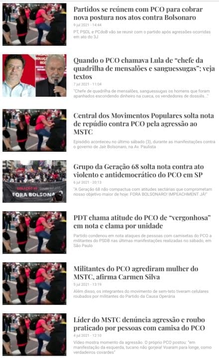 Perceba que, no mesmo print acima, a Revista Fórum repercute posições de diferentes atores políticos diretamente contra o PCO, como parte da mesma campanha de calúnias.