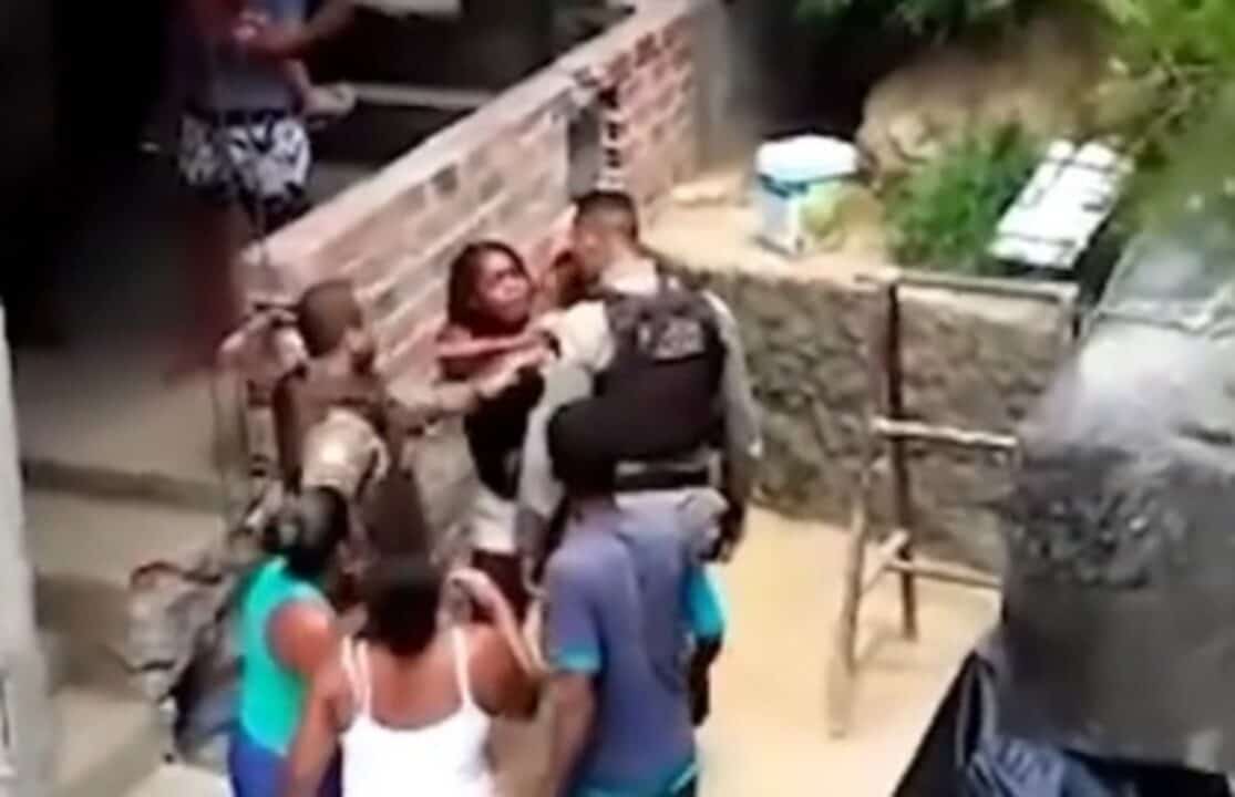 Em um vídeo, é possível ver o momento em que o policial dá um tapa na mulher que segura a criança.