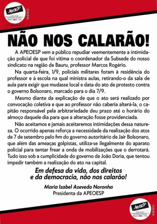 Nesta quarta-feira (1) a Polícia Militar foi à casa e à escola em que trabalha o coordenador da subsede da Apeoesp de Bauru, para intimidá-lo e exigir que mude a data e o local do ato Fora Bolsonaro na cidade, previsto para o próximo dia 7 de setembro.