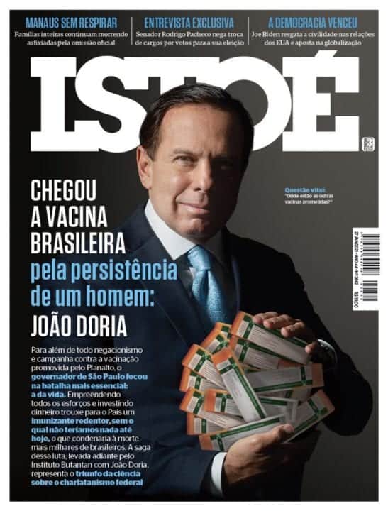 É esse o caso, por exemplo, da mais nova capa da revista IstoÉ, apelidada por seus desafetos de Quanto É?, tamanha sua falta de escrúpulos. Na edição desta semana, a revista apresenta João Doria, governador golpista de São Paulo, como o maior herói da vacinação contra o coronavírus: