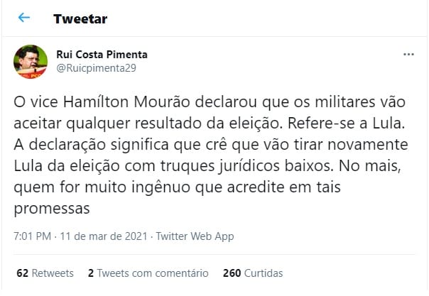 No twitter Rui Costa Pimenta, presidente do Partido da Causa Operária (PCO), comentou a declaração do vice-presidente Hamilton Mourão sobre as eleições de 2022, veja: