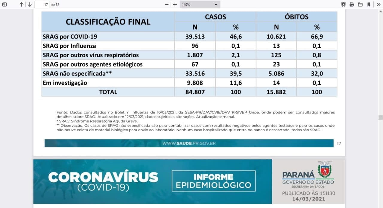 Ao somar 13.478 com 10.621, chega-se a 24.099 mortos por coronavírus no Paraná, em dados oficiais! Ou seja, considerando outros meios de subnotificação, há muito mais mortos do que estes cerca de 25 mil apontados pelo boletim.
