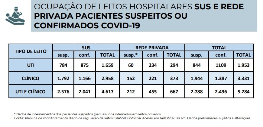 Os mais de 13 mil casos de mortes por coronavírus, no entanto, são apenas uma parte da realidade trágica do estado. Isto porque no próprio boletim do coronavírus da Secretaria de Saúde, há um outro dado que o governo procura ocultar: as mortes por SRAG (Síndrome Respiratória Aguda Grave) por coronavírus. Segundo o boletim do dia 14/03/21, foram 10.621 pessoas que tinham SRAG e morreram por contraírem coronavírus.
