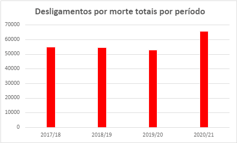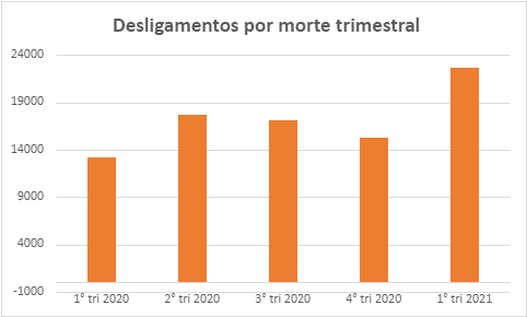 Os desligamentos por morte nos quatro primeiros meses de 2021 atingiram a marca de 35.125 registros, que corresponde 55,16% de todo período de 2020 e 66,56% de 2019. O excesso de desligamentos por morte durante o período da pandemia, de março de 2020 até abril de 2021, que considera a média de desligamento dos anos anteriores, totaliza quase 14 mil trabalhadores.