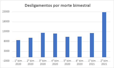 O aumento do nível de desligamentos de trabalhadores por morte se consolida com a chegada mês de abril de 2021, quando as mortes diárias por Covid-19 atingiram a marca de 5 mil pessoas, e se torna bastante visível os impactos da pandemia. Do primeiro para o segundo bimestre de 2021 há um salto de 12.288 para 22.837 mortes, uma variação de 85,8%. Em comparação ao segundo bimestre de 2020, que teve 9.896 mortes, uma variação de 130,7%. Se compararmos os desligamentos no mês de abril de 2021 com a média do ano de 2019, quando não a pandemia ainda não havia chegado no Brasil, a variação é de 166%.