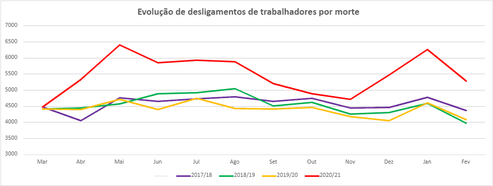 Para se ter uma melhor compreensão dos impactos da pandemia da Covid-19, é preciso verificar o comportamento das curvas de desligamentos de trabalhadores por morte, não somente do ano anterior ao último período em comparação, mas também dos anos que o antecederam para verificar um padrão para então tirarmos as devidas conclusões. Desta forma, elaborou-se um gráfico baseado em estudos obtidos através de dados do Cadastro Geral de Empregados e Desempregados (Caged). A curva a ser analisada tem início em março de 2020, mês onde foram registradas as primeiras mortes provocadas pelo coronavírus, e término em fevereiro de 2021, quando a pandemia completou um ano desde sua chegada ao Brasil. As demais curvas para comparação contemplam o mesmo período em anos anteriores (2017/18, 2018/19 e 2019/20).