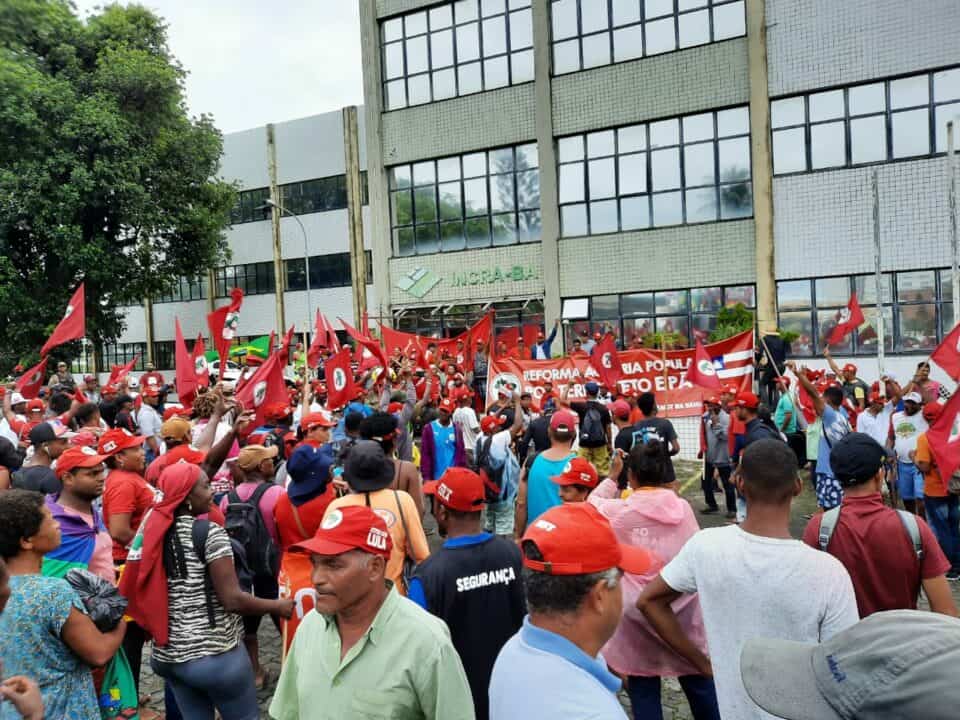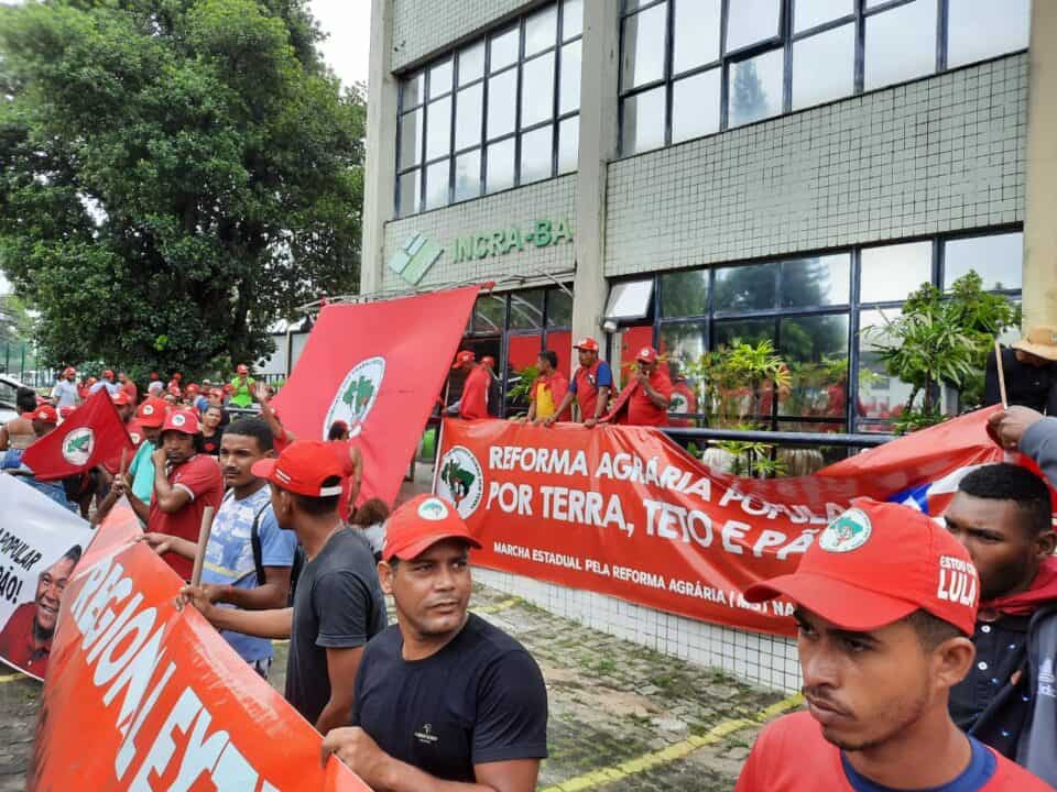 Um grupo de 2000 pessoas, saiu de assentamentos em Feira de Santana, a cerca de 100 quilômetros de Salvador, no dia 11 de abril, e chegou nesta segunda à capital baiana e ocuparam a sede do Instituto Nacional de Colonização e Reforma Agrária (Incra), no Centro Administrativo da Bahia (CAB), em Salvador. Além das pautas de denuncia contra a violência no campo, fome e a paralisação da reforma agrária na Bahia, os militantes trouxeram no discurso, o mês de abril, mês vermelho de Eldorado dos Carajás, onde em 1996, foram assassinados 21 campezinos.