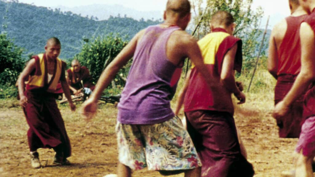 Não por acaso, a cena inicial começa com um pequeno jogo de bola entre os jovens monges no pátio do mosteiro. No lugar da bola, eles chutam aleatoriamente uma lata amassada de coca-cola. Quando o mestre aparece, eles deixam rapidamente a brincadeira para voltar à disciplina.