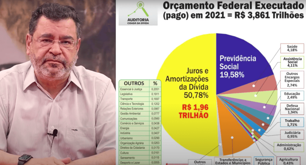Rui Pimenta denunciou o que os banqueiros e especuladores realmente querem dizer quando afirmam que a responsabilidade fiscal é importante porque se houver inflação e outros males da economia, quem vai pagar é o trabalhador. A realidade foi dada pelo gráfico apresentado pelo companheiro na Análise, da Auditoria Cidadã da Dívida, mostrando o quanto do orçamento federal vai para os banqueiros: quase 2 trilhões de reais, cerca de 51% do Orçamento Federal.