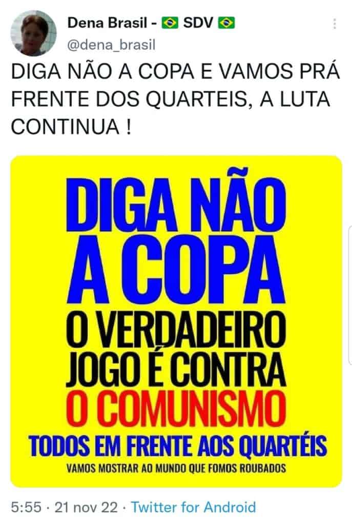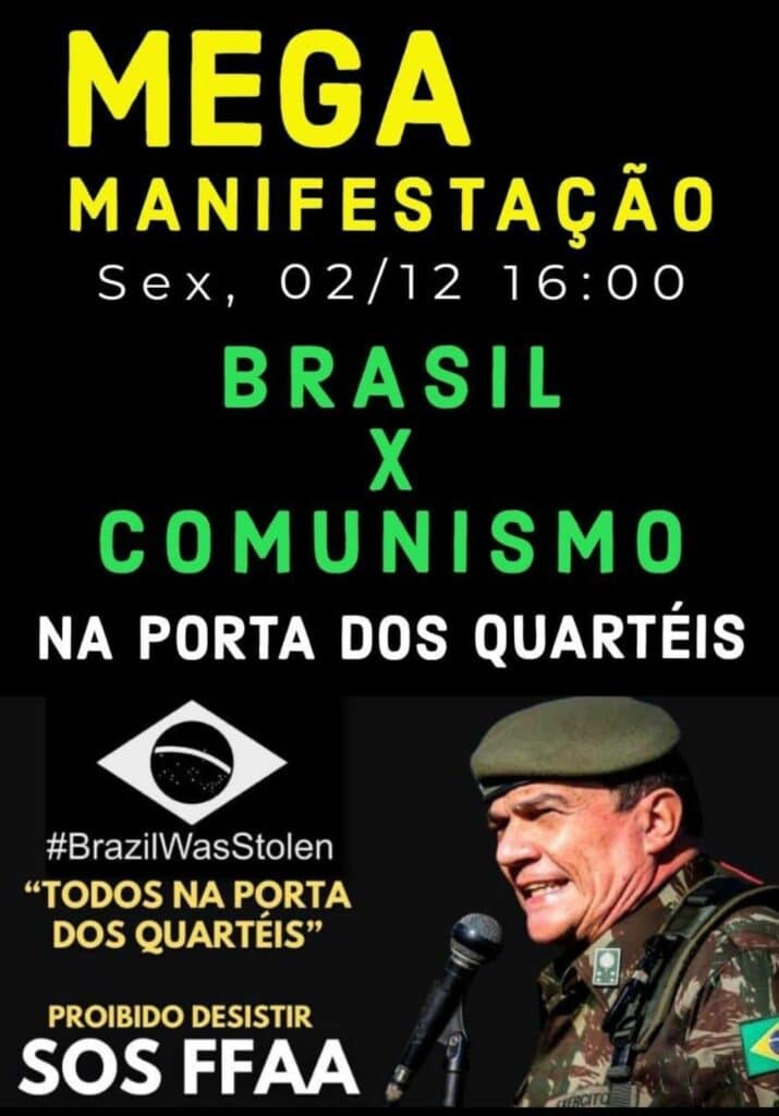 Além disso, os bolsonaristas também marcaram manifestações no dia e no horário do jogo do Brasil contra Camarões na frente dos quartéis das Forças Armadas. A chamada para a mobilização ainda possui uma hashtag em inglês: #BrazilWasStolen, ou seja, o “Brasil foi roubado”, em referência provavelmente às denúncias de fraude nas eleições.
