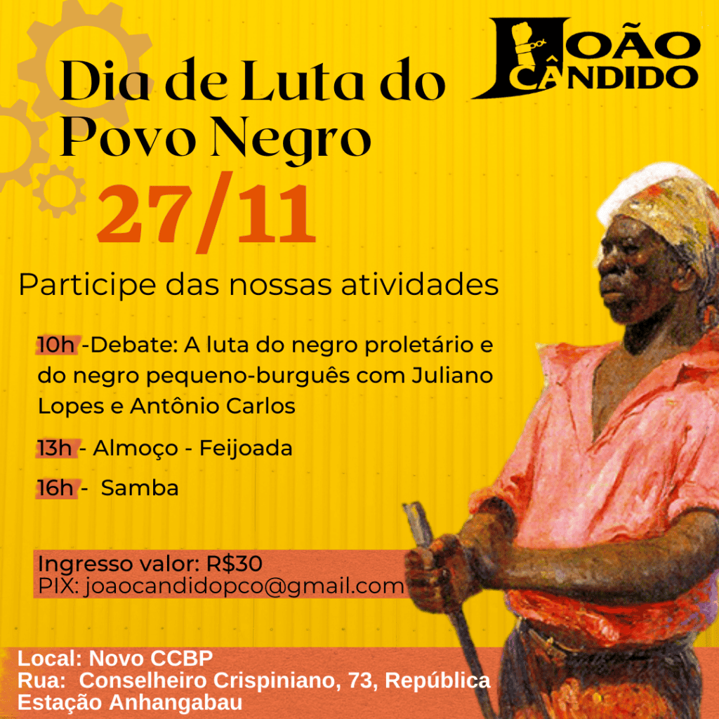 O coletivo de negros João Cândido do Partido da Causa Operária realiza um dia de atividades em encerramento do mês de luta do povo o negro, que está acontecendo agora.
