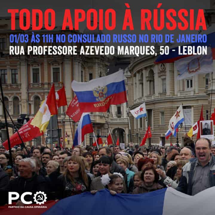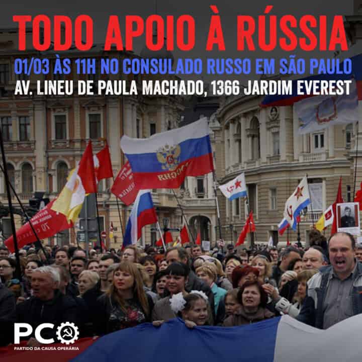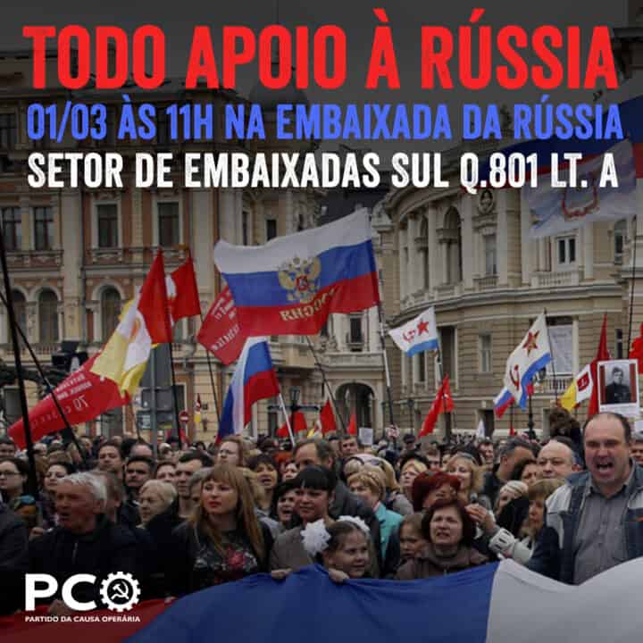 É preciso responder a essa campanha mentirosa e mostrar que a esquerda revolucionária e a classe operária mundial apoiam a ação da Rússia contra o imperialismo. Por conta disso, o Partido da Causa Operária está chamando três atos simultâneos em apoio à ação russa. Os atos ocorrerão amanhã (dia 1 de março), em frente à Embaixada Russa em Brasília e nos consulados russos de São Paulo e Rio de Janeiro.