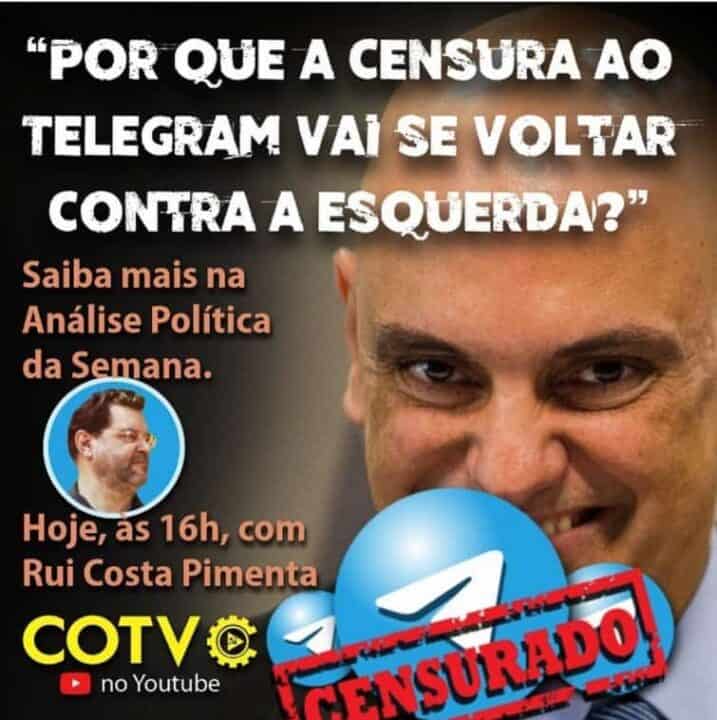 Não perca hoje, às 16:00 horas a Análise Política da Semana do o companheiro Rui Costa Pimenta que vai tratar entre outros assuntos a censura do aplicativo russo “Telegram” no Brasil pelo STF.