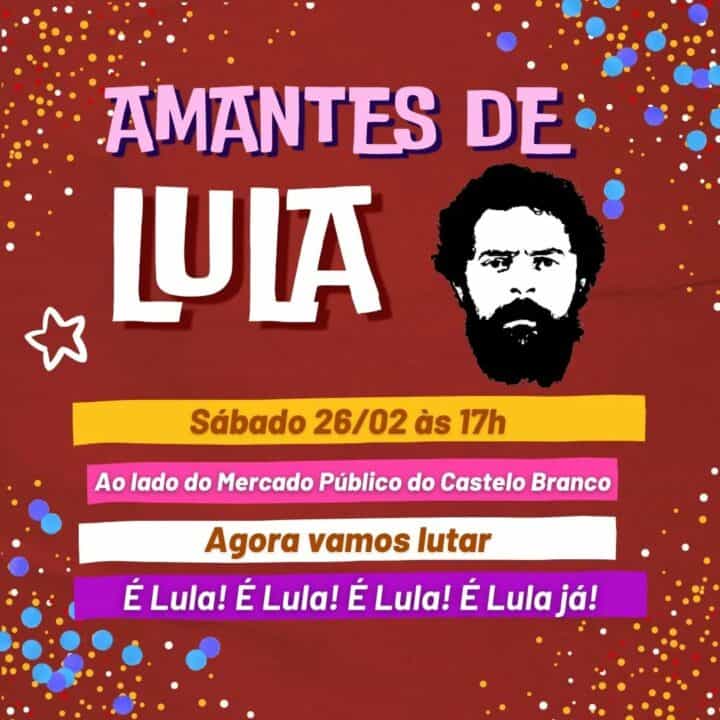Neste sábado (26/02), o bloco de carnaval “Amantes de Lula” fará a sua grande estreia às 17h, um verdadeiro ato de luta contra o golpe e defesa da cultura popular, com folia e união da esquerda em torno de uma posição revolucionária. A brincadeira acontecerá em João Pessoa, capital paraibana, no bairro do Castelo Branco ao lado do Mercado Público do Castelo Branco, sendo uma iniciativa do Bloco Vermelho e do bloco carnavalesco Quengas de Peito.