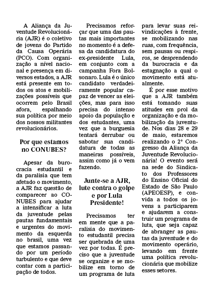 Precisamos reforçar que uma das pautas mais importantes no momento é a defesa da candidatura do ex-presidente Lula, em conjunto com a campanha Fora Bolsonaro. Lula é o único candidato verdadeiramente popular capaz de vencer as eleições, mas para isso precisa do intenso apoio da população e dos estudantes, uma vez que a burguesia tentará derrubar ou sabotar sua candidatura de todas as maneiras possíveis, assim como já o vem fazendo.