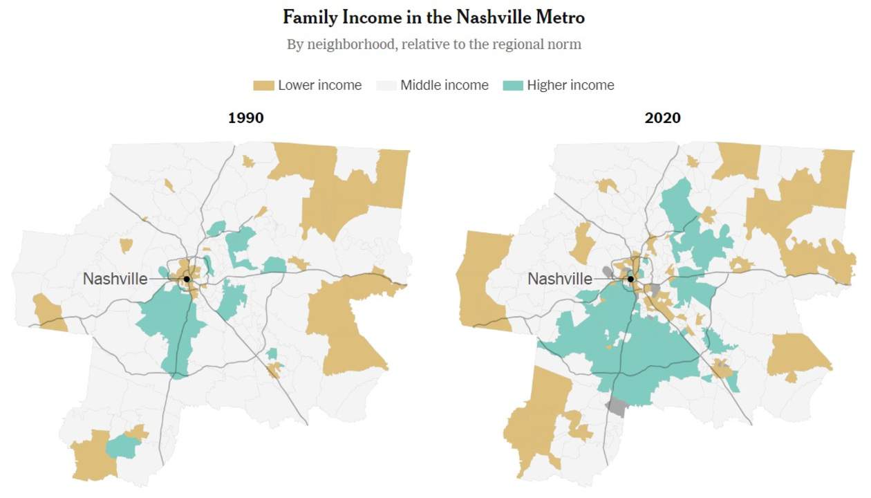 Tratemos dos dados presentes no artigo do NYT. O percentual de famílias vivendo em bairros de “classe média” – bairros que não passaram pelo crivo ou de profunda elitização, ou de profunda precarização – em 25 dos maiores centros urbanos norte-americanos em 2020, foi comparado com a mesma cifra referente ao ano de 1990. A queda é universal (não há exceção alguma), e não é restrita a estes centros urbanos, mas sim ao conjunto de todas as áreas metropolitanas dos Estados Unidos: 62% das famílias viviam em bairros de classe média em 1990, e, hoje, este número desceu para pouco menos de 50%.