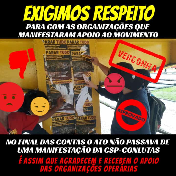Denunciamos aqui neste diário a falta de união sindical, total arrogância e infatilidade da CSP-CONLUTAS que foi denunciado nas redes sociais da página “Oposição Metalúrgica” no endereço abaixo: