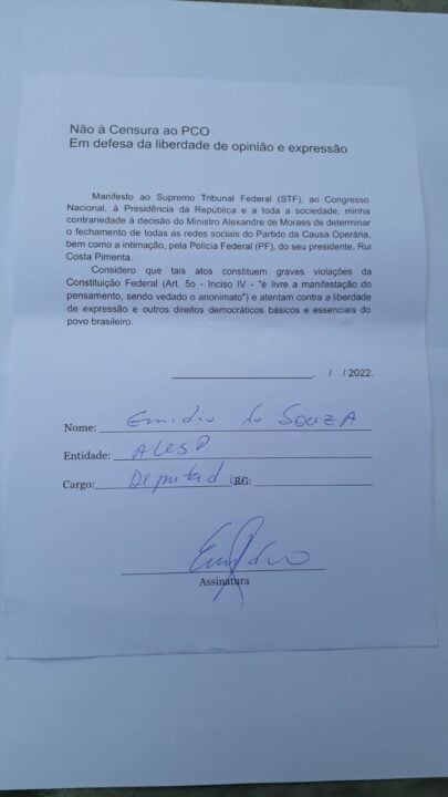 O deputado estadual Emidio de Souza do Partido dos Trablhadores (PT), assinou uma declaração em apoio a luta do Partido da Causa Operária na luta contra a ditadura e censura da liberdade de expressão de um partido legalizado por fazer oposição ao sistema vigente no país.