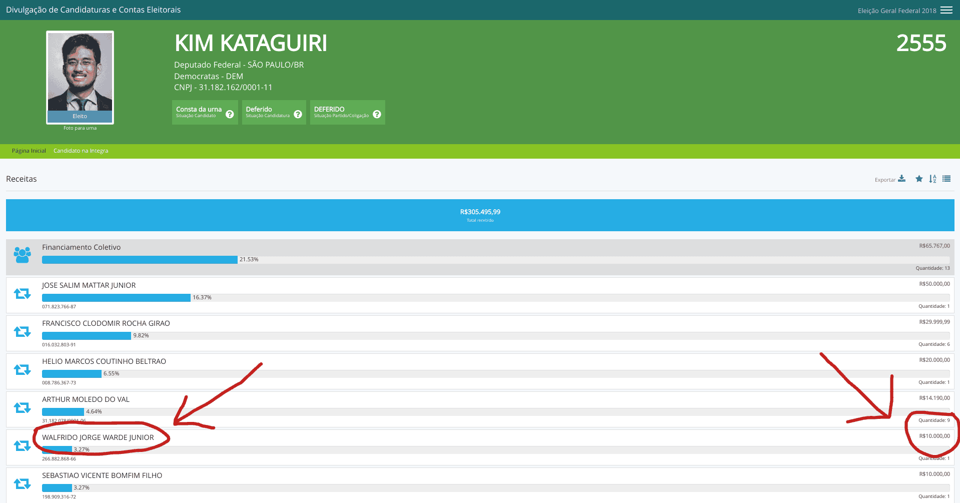 A página de Kim Kataguiri no sítio do Tribunal Superior Eleitoral (TSE) para a divulgação de candidaturas e contas eleitorais aponta que Warde foi o quinto maior doador particular de sua campanha naquelas eleições, injetando R$10.000.
