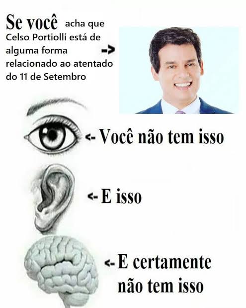 A página produzia memes tipo esse da imagem. “Se você acredita que ele (Celso) está relacionado de alguma forma com o 11 de setembro, você não tem isto (olhos), não tem isto (ouvidos) e certamente não tem isto (cérebro)”.