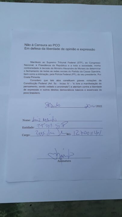 O ex-ministro do governo Lula, companheiro Luiz Marinho do Partido dos Trabalhadores – PT, assinou uma declaração em apoio a luta do Partido da Causa Operária na luta contra a ditadura e censura da liberdade de expressão de um partido legalizado por fazer oposição ao sistema vigente no país.