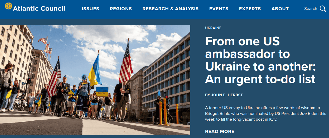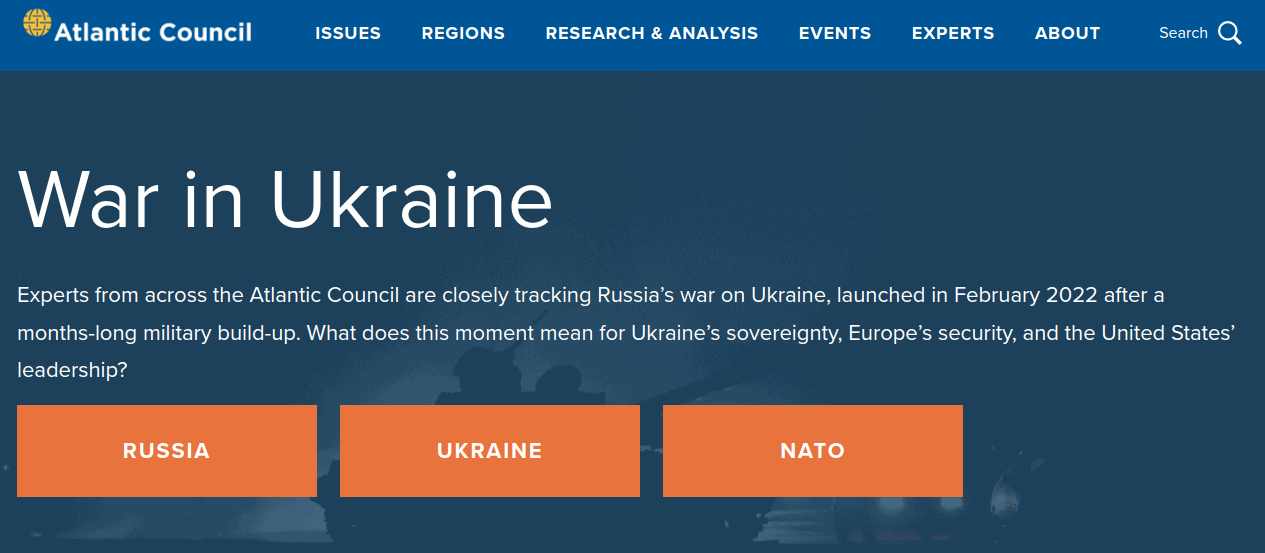 A Atlantic Council, surgiu com a missão de encorajar a permanência da OTAN e apresenta uma das maiores expertises em assuntos eurasiáticos, ao lado da Randy Corporation, porém, com o selo e tradição de atuação durante o Maidan, tendo recebido contribuições de 20 países na última década, assumindo uma posição de proeminência na política antirrussa. A política Atlantic Council em