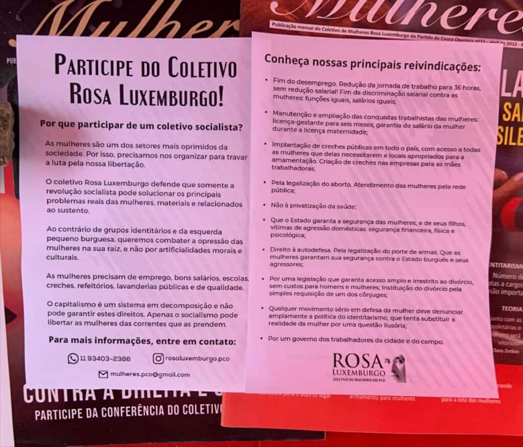 O coletivo de mulheres Rosa Luxemburgo, do Partido da Causa Operária, na regional do Rio de Janeiro (PCO-RJ), realiza uma atividade de rua semanal às quartas-feiras, às 17 horas, na Cinelândia, em frente à Câmara Municipal. A programação do coletivo divulga a política partidária com panfleto próprio, a revista Mulheres, imprensa do coletivo, o Jornal Causa Operária e outros materiais. As companheiras convidam todas e todos os interessados a participar da atividade, que é aberta, assim como a conhecer o coletivo e o Partido.