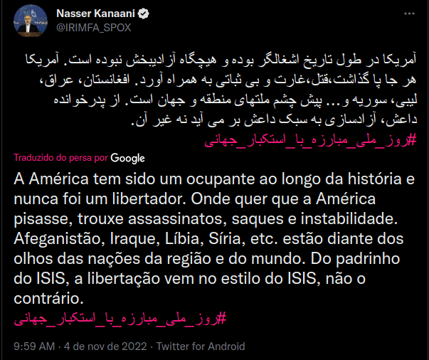 Através de uma mensagem emitida nesta sexta-feira (4), em sua conta no Twitter, o porta-voz do Ministério das Relações Exteriores do Irã, Naser Kanani, denunciou que os Estados Unidos sempre foram um ocupante da história e que nunca pode ser um libertador e onde quer que intervenha, não trouxe nada além de assassinato, saques e instabilidade. Segundo o porta-voz iraniano, países da região e do mundo estão testemunhando as consequências da presença militar dos EUA em países como Afeganistão, Iraque, Líbia e Síria.