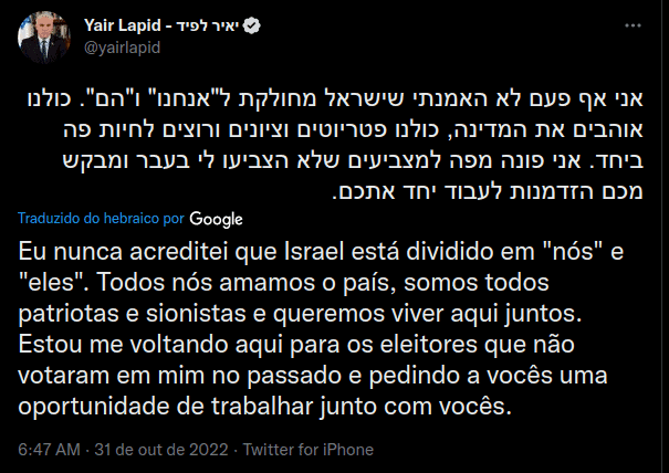 Netanyahu, o primeiro-ministro mais longevo do país, que governou na década de 1990 e mais tarde de 2009 a 2021, foi destituído do poder no ano passado. Um novo governo foi formado sob um acordo multipartidária liderado pelo partido Yesh-Atid de Lapid e Yamina de Naftali Bennett. O gabinete incluía membros de um amplo espectro de ideologias políticas, com Bennett e Lapid liderando como primeiros-ministros alternados. Essa composição não deu certo, a Arábia Saudita começou a flertar com jihadistas, o Irã verticalizou seu sistema de defesa, a Síria se tornou mais instransponível e a resistência palestina e o Hizbollah se fortaleceram, e isso que importa em um Estado artificial, criado para matar. Apesar disso, a suposta ameaça do mal maior, Netanyahu, Lapid tenta se passar por moderado, e no Twitter não para de divulgar que todos os “democratas” vão às urnas, inclusive utilizou-se do universal discurso de paz do regime político, o que parece ser inútil a este momento, pois Netanyahu continua muito forte.